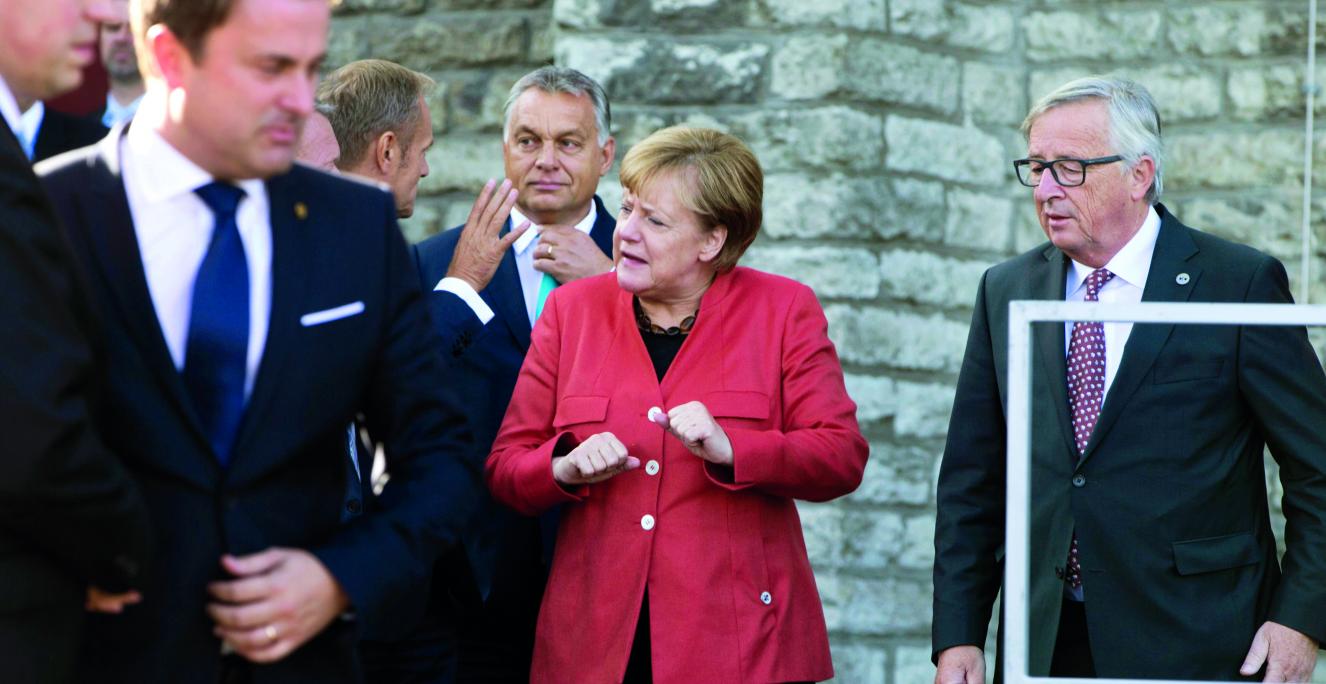 Tyske Angela Merkel taler med en skjult Lars Løkke Rasmussen i Tallinn i september 2017. I baggrunden diskuterer formanden for Det Europæiske Råd Donald Tusk fra Polen med Ungarns premierminister Viktor Orbán. Til højre lytter Europakommissionens formand Jean-Claude Juncker med. Ifølge journalist Adam Holm betyder EU’s nuværende samarbejdsproblemer ikke nødvendigvis, at Europa synker ned i kaos. For det er fra en helt anden hånd, at freden hidtil er blevet sikret.