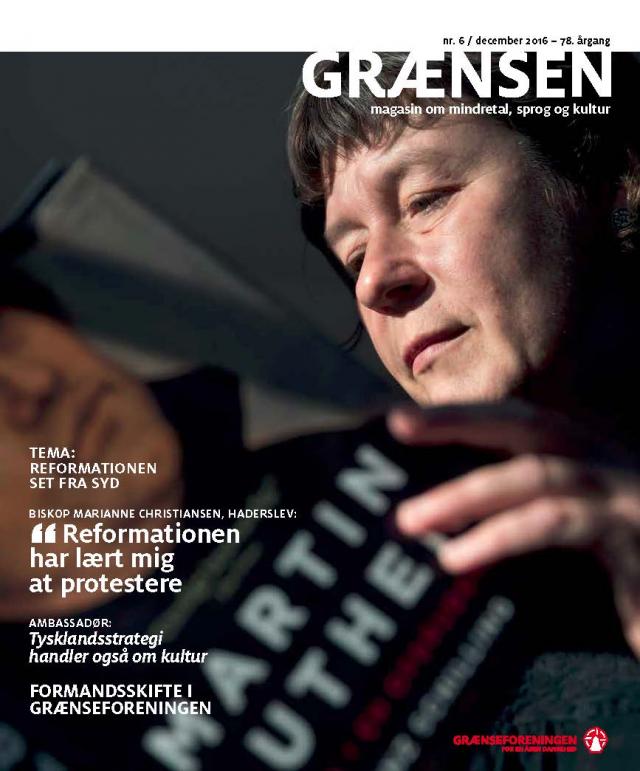Hent magasinet som PDF Magasin tema: Reformationen set fra syd Arven efter Luther er også protest Arven efter Luther er også protest Interview Reformationen set fra syd Marianne Christiansen er biskop i Haderslev Stift, hvor Reformationen fandt sted tidligere end i det øvrige Danmark. Grænselandet viser vej både dengang og i dag, siger biskoppen, der samtidig peger på, at lutherdommen forpligter den enkelte til at handle efter sin samvittighed Reportage Reformationen set fra syd Den tyske kirke løfter arven bedst Nyhed Reformationen set fra syd Rollespil om Luther vinder frem Artikel Reformationen set fra syd Danskerne kunne have talt plattysk Andre artikler i magasinet Anmeldelse Civilbefolkningen betalte en pris i 1864 Interview ”Jeg vil insistere på at møde mennesker” Kommentar Ikke enten-eller, men både-og Reportage ”Vi er hurtigt blevet vant til hinanden” Reportage Ny dansk-tysk børnehave er kommet godt fra start Artikel ”Vi vil gerne præge vores børn med tysk kultur” Essay De danske dialekter har det svært Bagside Et værn mod fjenden der aldrig kom Anmeldelse Dengang populisme var religiøs Kommentar Find en varig løsning for Christianslyst Leder Det skrøbeligste porcelæn Portræt En ydmyg sønderjyde, der kan ”æ sproch”